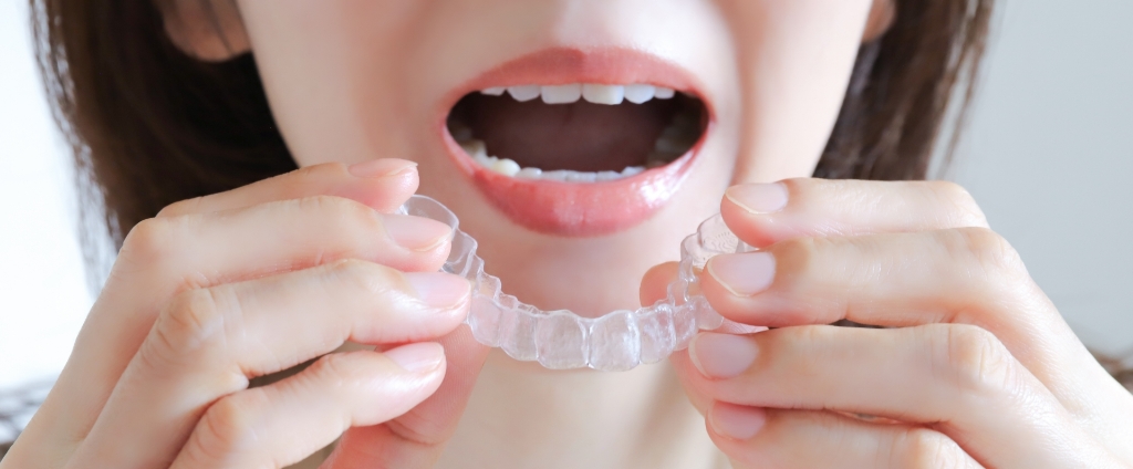 透明で目立ちにくく、取り外し可能。軽〜中等度の症例に適応。※装着時間を守る必要あり。